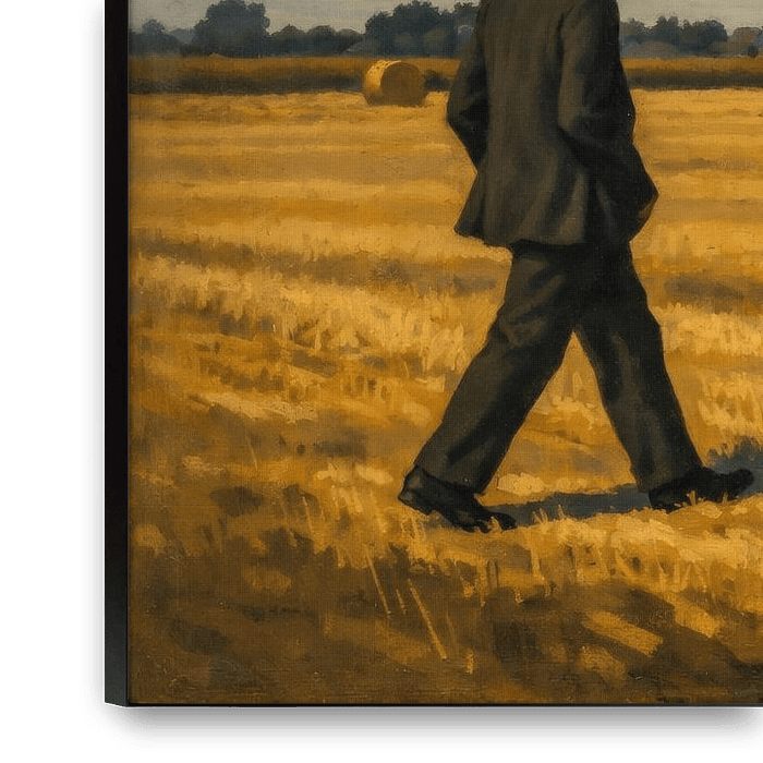 In diesem stimmungsvollen Landschaftsgemälde „Die Inspektion“ spaziert ein stattlicher Mann in dunklem Anzug und Hut durch ein weitläufiges Getreidefeld nach der Ernte, umgeben von goldgelben Strohballen und einem weiten holländischen Himmel voller Wolken. Die ländliche Szene strahlt Ruhe, Weite und Tradition aus und ruft Bilder von…
