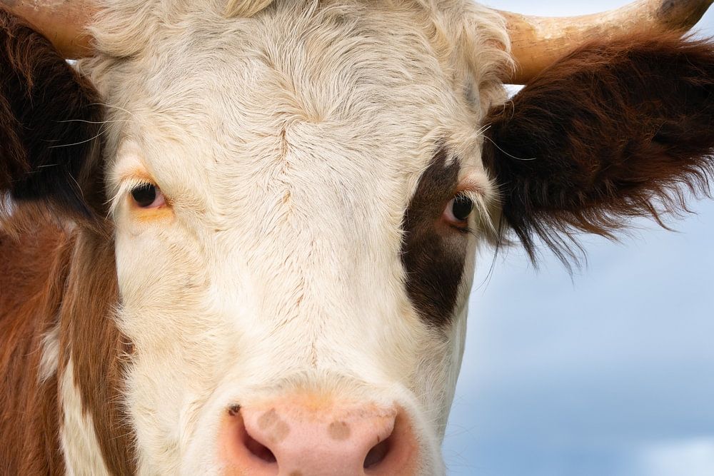 Porträt einer braun weiß gefleckten Milchkuh, die den Betrachter ansieht. Ein Auge der Kuh im weißen Gesicht ist braun umrandet. Das Tier hat Hörner.