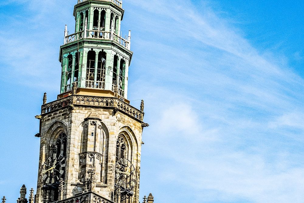 Die Martinitoren in Groningen mit einem schönen blauen Himmel im Hintergrund.