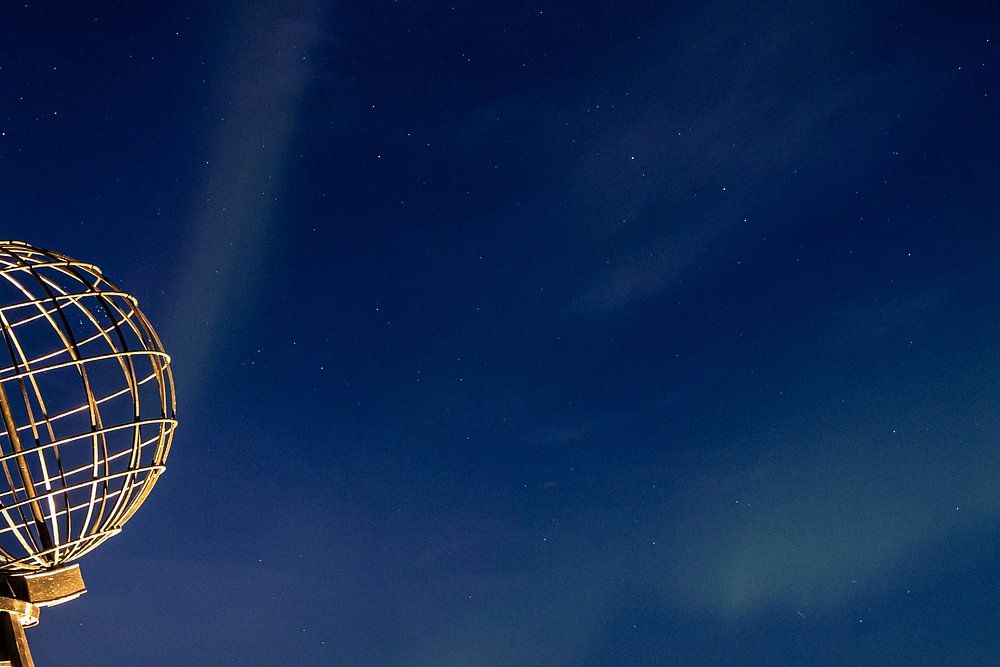 Es ist etwas ganz Besonderes, das Nordlicht an der Spitze Europas zu sehen. Das tanzende Polarlicht über dem Nordkap-Denkmal in Norwegen.