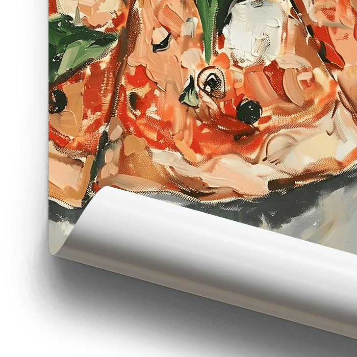 In diesem Kunstwerk wird eine leckere Pizza in einer Mischung aus warmen und sanften Farben und Tönen zum Leben erweckt, die sich wunderbar miteinander vermischen und eine warme Atmosphäre hervorrufen.