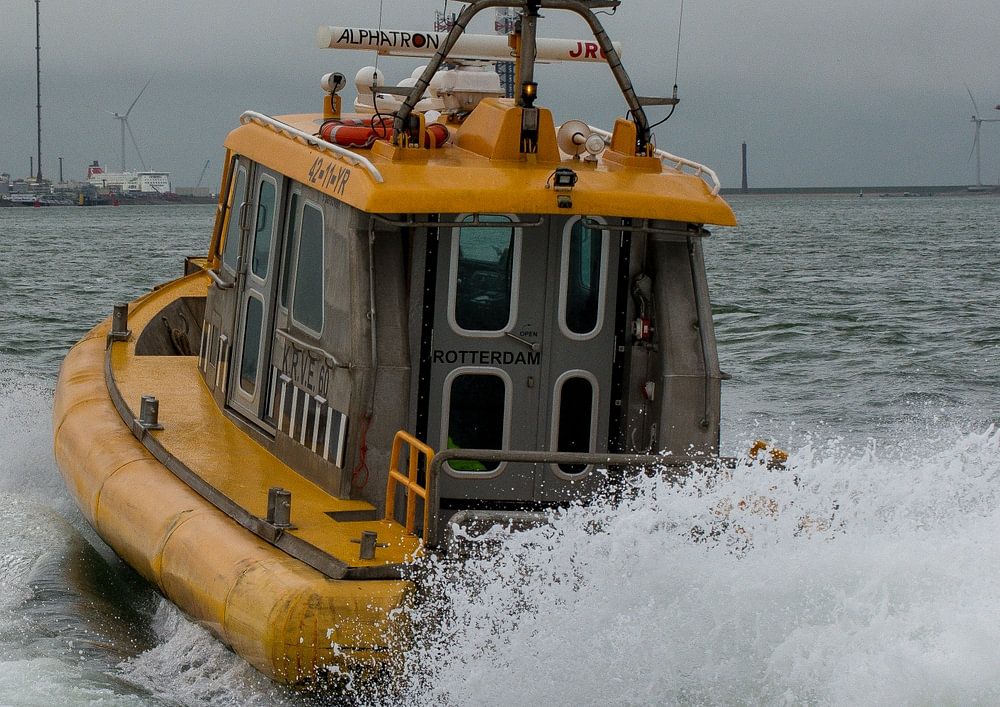 Die Ruderer auf der Maasvlakte mit Schwung. Das Ruderboot, die Containerschiffe, die Kräne, die drohenden Wolken, die LNG-Gastanks und das spektakuläre Propellerwasser. Die Ruderer sind immer in Bewegung, von Schiff zu Schiff. Das Schiff legt an oder das Schiff fährt ab, die Ruderer werfen die Taue ab oder umrunden die Poller. Bei stürmischem Wind, Regen und Sonnenschein sind die Ruderer bereit. Die großen Hochseeschiffe sind bereit zum Anlegen, die Ruderer bringen die Festmacherleinen an Land.