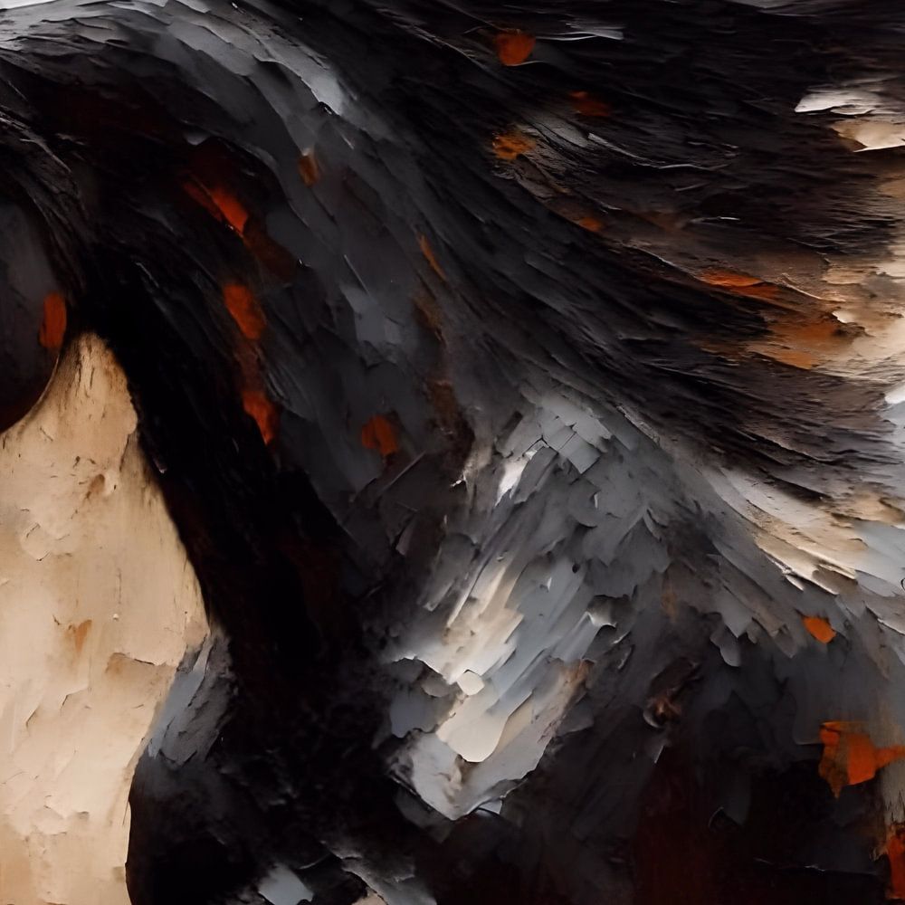 Ein majestätisches schwarzes Pferd ist in Bewegung vor einem unscharfen Hintergrund dargestellt, der auf Geschwindigkeit und Bewegung hindeutet. Die Mähne und der Schweif des Pferdes werden vom Wind gepeitscht, was die Dynamik der Szene unterstreicht.