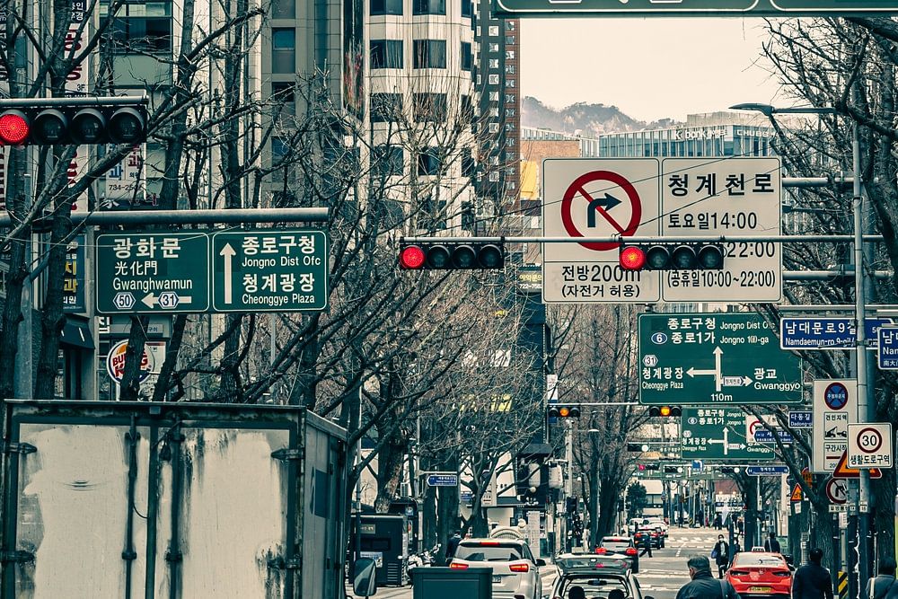 Die Straßen von Seoul in Südkorea mit Lastwagen und Autos, Menschen und geschäftigen Verkehrsschildern. Allgemeine geschäftige Atmosphäre auf der Straße.