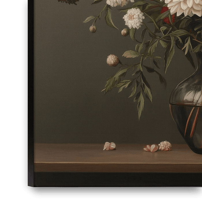Im Mittelpunkt dieses digitalen Stilllebens steht eine Glasvase, in der die Stängel sichtbar durch das Wasser laufen. Es ist ein subtiles Detail, das dem Werk seinen eigenen Charakter verleiht: klar, offen und fast greifbar. Über der Vase entfaltet sich ein üppiger Strauß von Dahlien und Zwiebelblumen in Weiß-, Zartrosa-, Korallen-,…