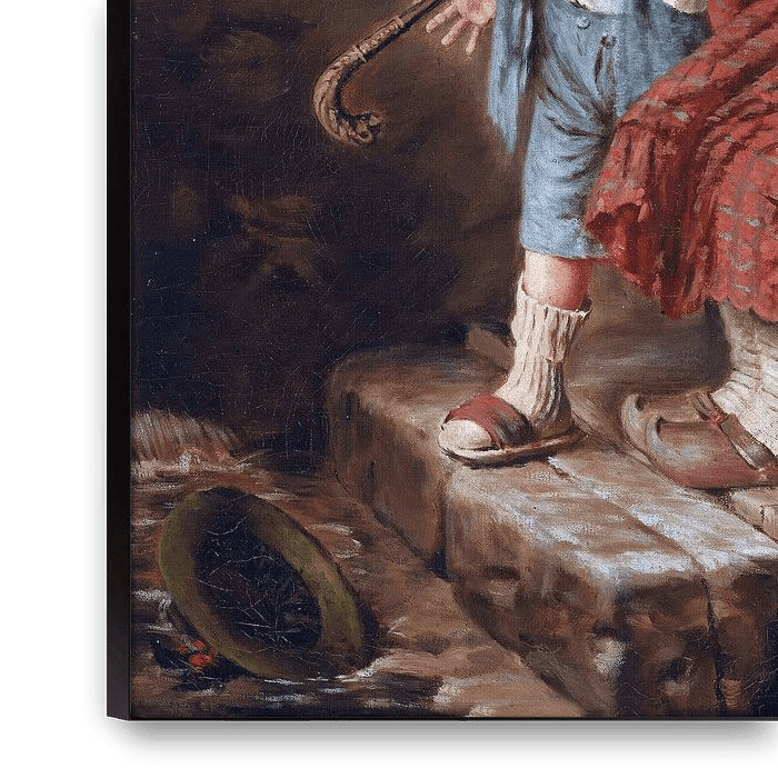 Das Mädchen überrascht den Jungen, und sein Körper spricht für sich selbst. Die Kinder, unter Regenschirmen auf Clogs und Pantoffeln, machen einen etwas schäbigen Eindruck vom Anfang des 20.