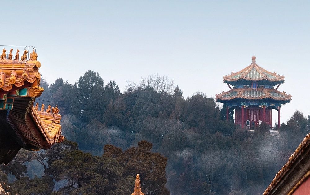 Blick auf die Verbotene Stadt in Peking. Schöne rote Mauern und orange/goldene Dächer - in einem Rahmen gesehen.
