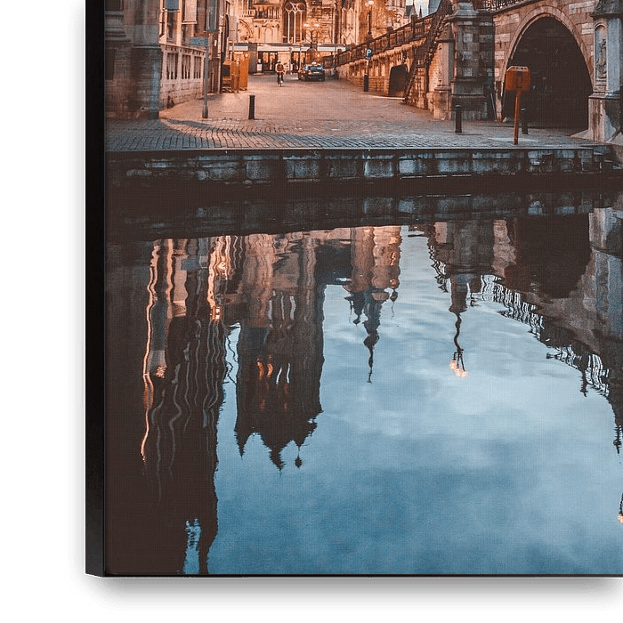 Früher Morgen in Gent, Spiegelung der drei Türme im Zentrum von Gent