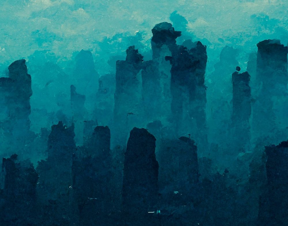 Schönes Ölgemälde einer Stadt in den frühen Morgenstunden. Als sich der Nebel und die Wolken langsam auflösen, werden die Umrisse der Wolkenkratzer sichtbar.