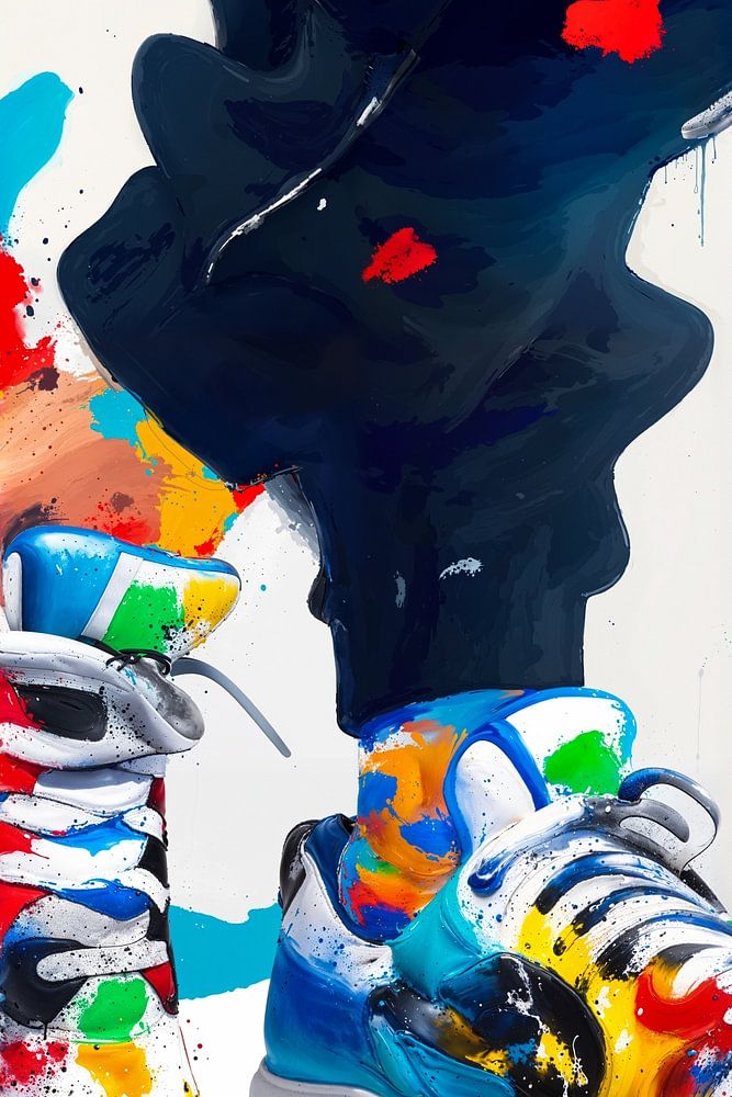 Die Komposition zeigt zwei Unterschenkel, die mit Spritzern und Flecken in leuchtenden Farben verschmiert sind, was darauf hindeutet, dass der Träger in voller Aktion war. Die Turnschuhe selbst verwandeln sich in improvisierte Pinsel, die über den Boden gleiten und tanzen, wobei jeder Schritt eine neue farbige Spur hinterlässt. Der Boden selbst wird zur Leinwand und Zeuge dieser dynamischen und unkonventionellen Malweise.