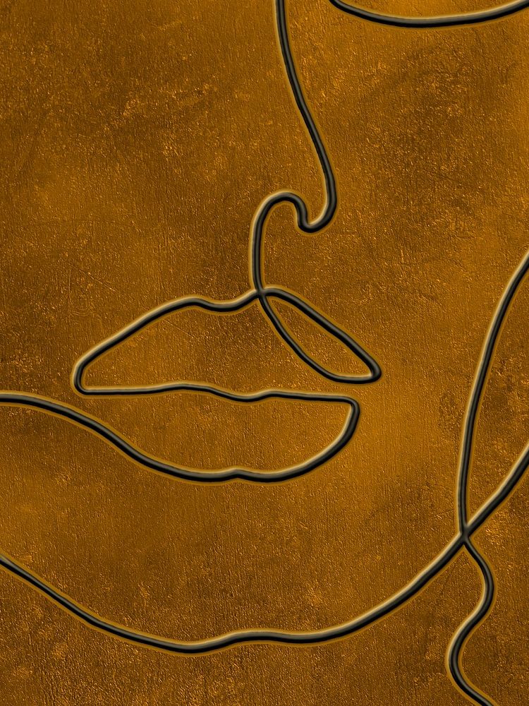 Strichzeichnung einer Frau mit lockigem Haar auf goldenem Hintergrund.