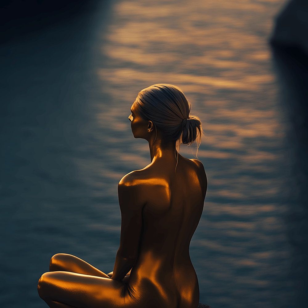 Dieses Werk zeigt die weibliche Form, elegant und kraftvoll, eingefangen in transparentem Acryl mit Schichten von Blattgold, die sich wie Adern durch das Bild ziehen. Das dunkle Blau spiegelt die Tiefe des Atlantiks an der portugiesischen Küste wider. Was dieses Werk so außergewöhnlich macht, ist das subtile Spiel des Lichts: als ob die Frau gerade vom letzten goldenen Tageslicht nach Sonnenuntergang berührt wird. Dieses seltene Leuchten, das nur für ein paar Minuten existiert, ist in diesem Bild für immer festgehalten.