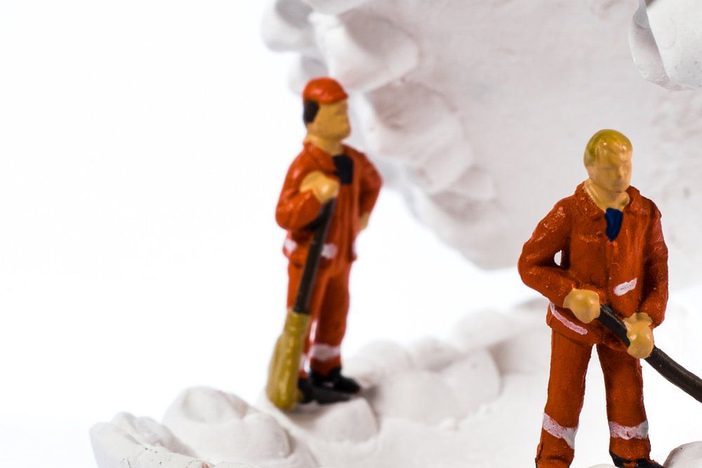 Kleine Figuren säubern ein Gipsmodell eines Gebisses mit Besen... Durch die Verwendung von Modellfiguren kann man oft eine völlig andere Welt schaffen und es entsteht ein verfremdendes Bild. In diesem Fall von Männern, die Gipszähne reinigen oder pflegen