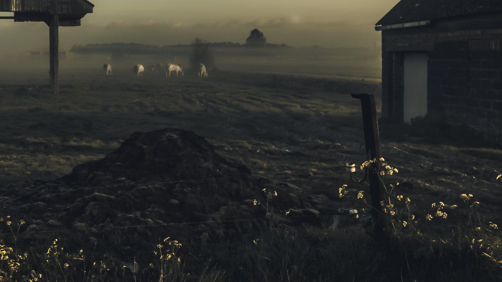 Weidende Kühe im Morgennebel , eine typische Polderlandschaft , Foto im Frühnebel aufgenommen .
