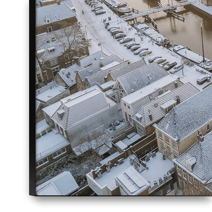 Die verschneite Thorbeckegracht in Zwolle an einem kalten Wintermorgen, von oben gesehen, mit Hausbooten in der Gracht und der Broerenkerk im Hintergrund. Die Dächer sind mit einer dünnen Schneeschicht bedeckt.