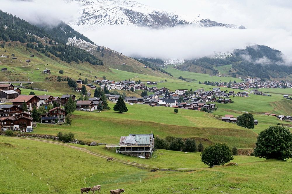 Dieni Graubünden Schweiz Blick Richtung Osten dem Tal entlang mit den Dörfern Rueri und Sedrun zwischen den Bergen.