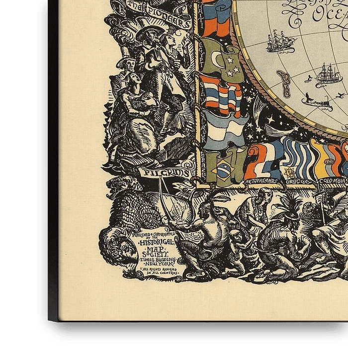 Diese Welt von uns zeigt die neuen nationalen Grenzen. Enthält ein Plädoyer für den Frieden, "Nation wird Schwert gegen Nation nicht heben, noch sollen sie Krieg mehr lernen." Blick auf die östlichen und westlichen Hemisphären, umgeben von Fahnen und historischen Szenen.
