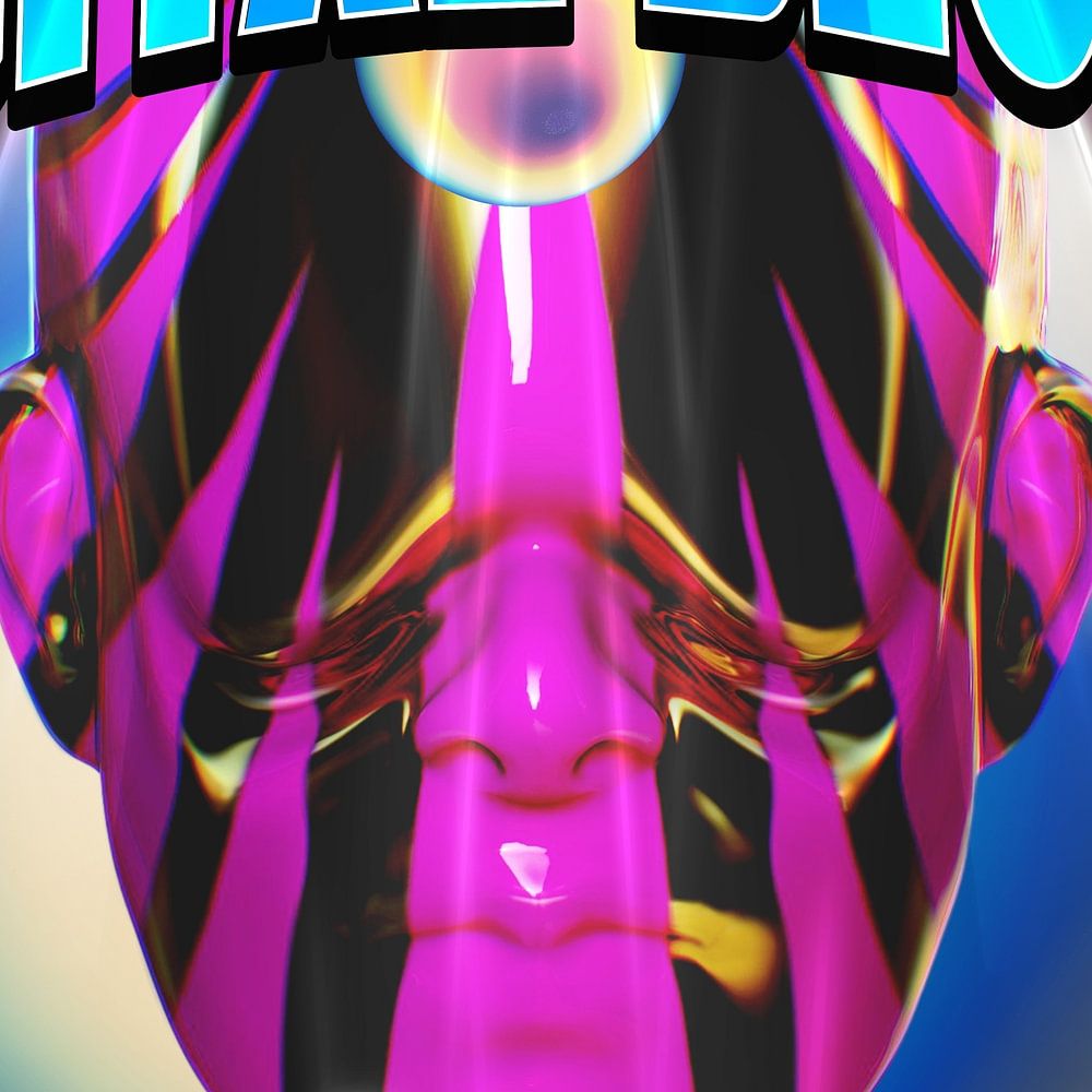Ein kühnes, elektrisierendes Design, das eine glänzende Figur in Neonfarben zeigt und digitalen Surrealismus und moderne Ästhetik vereint