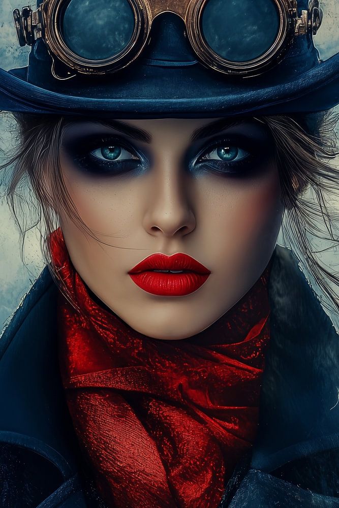 Ein bezauberndes Steampunk-Porträt, bei dem Vintage- und moderne Elemente in einem harmonischen Kontrastspiel verschmelzen. Ein blauer Zylinder mit kupferfarbener Steampunk-Brille bildet eine markante Silhouette vor einem nebligen Hintergrund, während ein feuerroter Seidenschal sich dramatisch von einer marineblauen Jacke abhebt. Das intensive Make-up mit verführerischen roten Lippen bildet einen kraftvollen Mittelpunkt dieser geheimnisvollen Komposition.