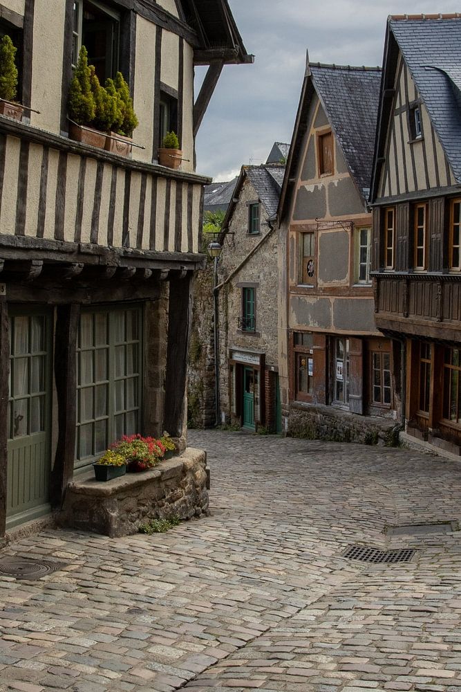 attraktive und charmante Straße mit mittelalterlichen Häusern in Dinan, Frankreich.