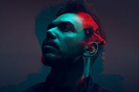 Diese künstlerische Fotografie zeigt eine männliche Figur mit einem geheimnisvollen und intensiven Blick, der mit einem Doppelbelichtungseffekt eingefangen wurde. Der primäre Gesichtsausdruck ist ernst und introspektiv, während die doppelten Schichten des Gesichts ein Gefühl von Bewegung, Schichtung oder innerem Kampf…