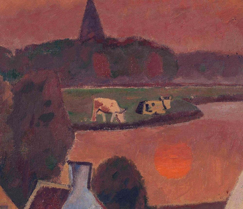Bild von Häusern in einer Landschaft mit Kühen und einer Kirche am Horizont. Gustave Franciscus (Gustaaf) De Smet (Gent, 21. Januar 1877 - Deurle, 8. Oktober 1943) war ein flämischer Maler. Zusammen mit Constant Permeke und Frits Van den Berghe gehörte er zu den großen Drei des flämischen Expressionismus. Er signierte seine Werke oft mit Gust. De Smet.