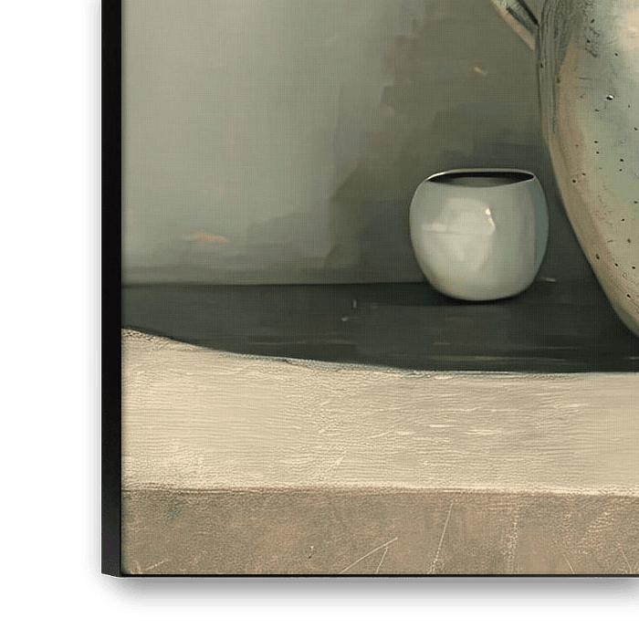 Krug Vogel - Dieses Stillleben zeigt einen kunstvoll geformten Krug neben einer kleinen Tasse, mit einem Vogel im Vordergrund vor einem sanft getönten Hintergrund.