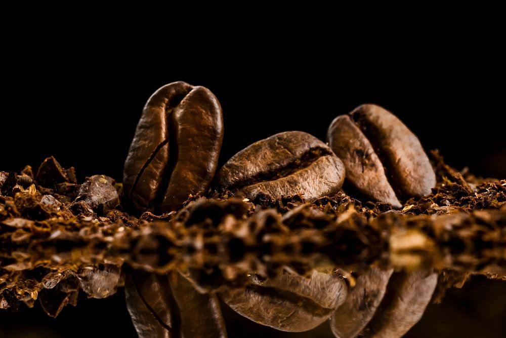 Schöne glänzende dunkel geröstete braune Kaffeebohnen. Die drei Bohnen liegen bereits zwischen den gemahlenen Bohnen. Bereit zum Zerkleinern und bereit, für eine Tasse Kaffee gefiltert zu werden.