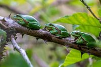 Laubfrösche sitzen oft in einer Reihe auf einem Brombeerzweig. Man kann sie auch auf einem Blatt oder in der Nähe von Bäumen und Sträuchern sitzen sehen. Dieses Bild wurde in der Brand in Udenhout/ Noord-Brabant/ Niederlande aufgenommen.