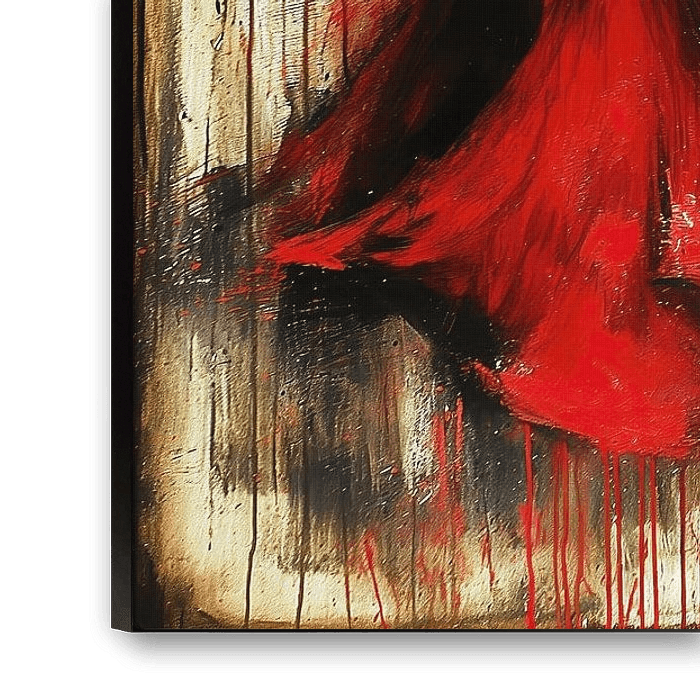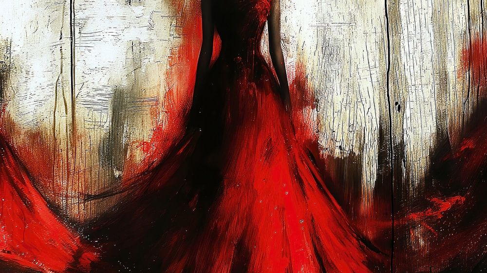 Dieses Kunstgemälde zeigt drei stilvolle Frauen, die in langen, fließenden roten und schwarzen Kleidern posieren. Die Eleganz ihrer Posen steht im Kontrast zum rauen, texturierten Hintergrund, der dem Bild eine besondere Tiefe und Struktur verleiht. Die Farbpalette aus kräftigem Rot und tiefem Schwarz hebt die weibliche Stärke und Anmut hervor, während die subtile Struktur im Hintergrund den modernen und zeitgenössischen Charakter des Kunstwerks unterstreicht. Diese Komposition strahlt Luxus, Selbstbewusstsein und Raffinesse aus und lädt den Betrachter ein, die Schönheit der Mode und den künstlerischen Ausdruck zu genießen.