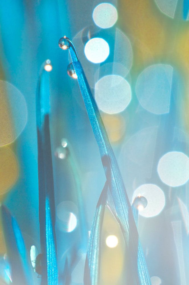 Een fotobewerking van druppels aan grassprieten. Door het zonlicht en de macrolens is er veel bokeh (lichtrondjes). De kleuren blauw en geel overheersen.