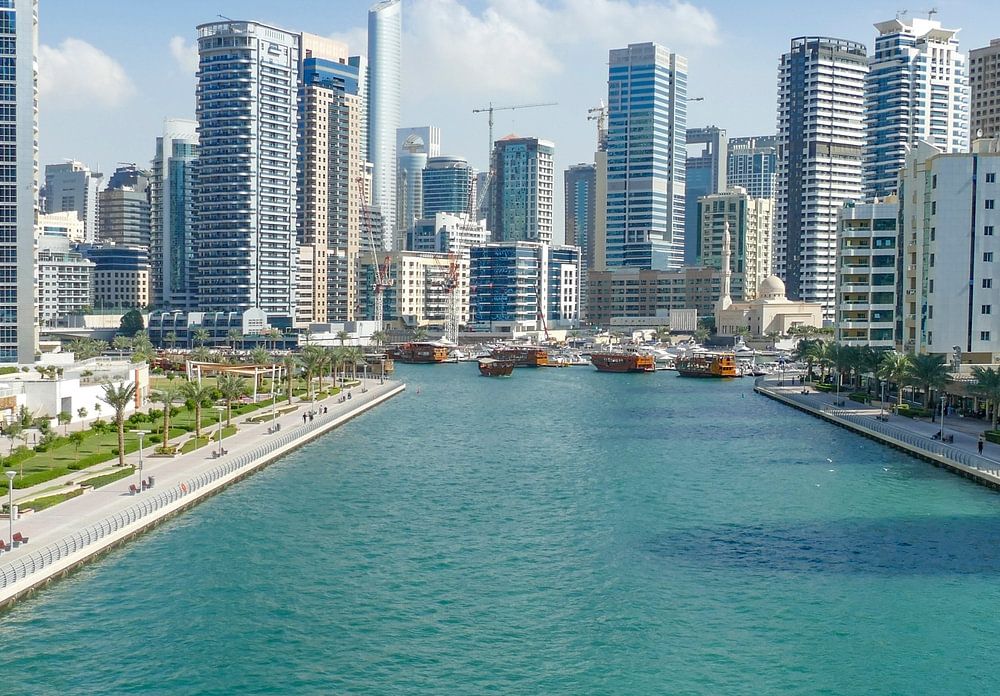 Stadtansicht rund um den Dubai Creek Marina in Dubai, der bevölkerungsreichsten Stadt der Vereinigten Arabischen Emirate