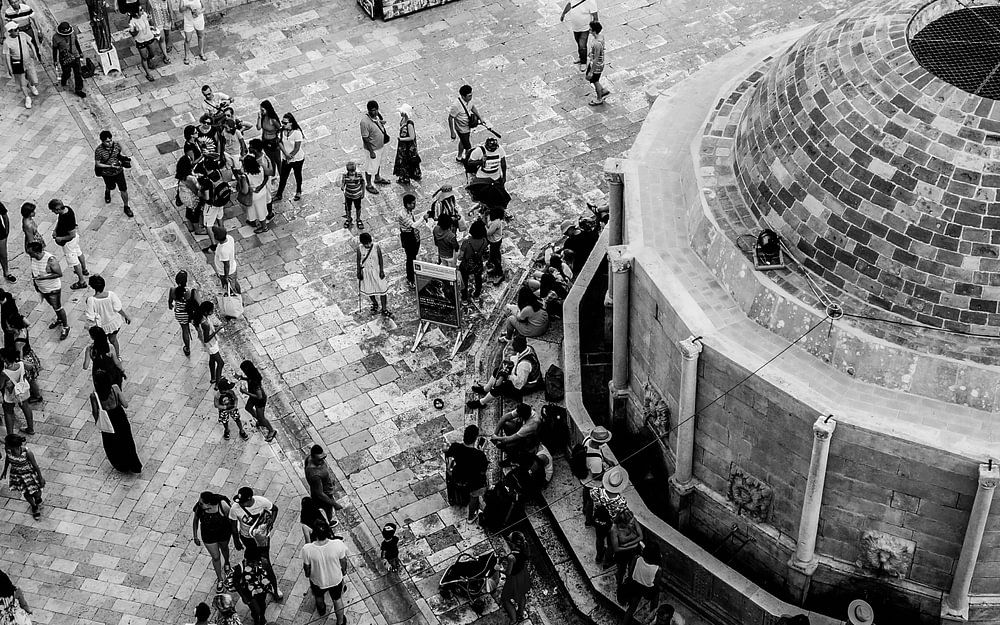 Genomen vanaf de hoge kasteelmuren in Dubrovnik, zicht op de hoofdstraat (stradun) en de Onofrio fontein.