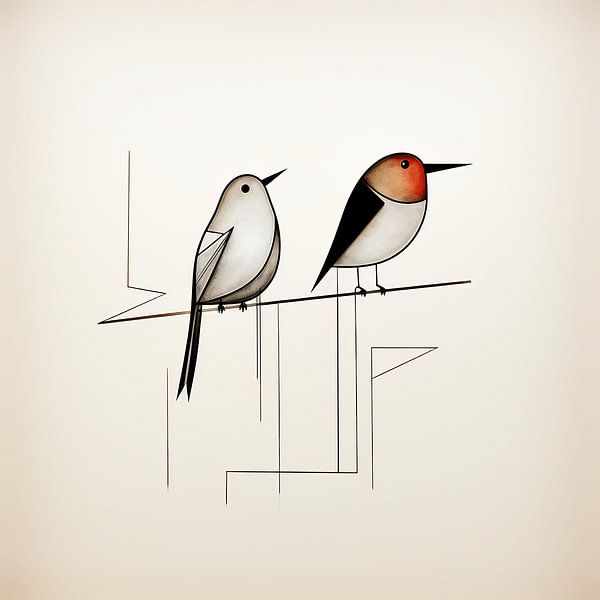 Eine minimalistische Illustration von zwei Vögeln, die auf einem Draht sitzen, ihre Silhouetten in einfachen schwarzen Linien dargestellt.