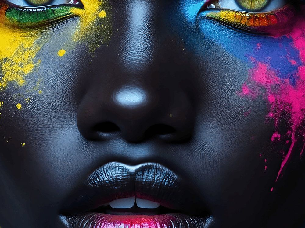 Das Porträt zeigt eine dunkelhäutige Frau, umgeben von intensiven Farben, die ihre Augen betonen. Die leuchtenden Blau-, Gelb- und Orangetöne umgeben ihren Blick und strahlen eine kraftvolle Energie aus, als wolle sie in die Seele des Betrachters eindringen. Ihre Augen scheinen tiefgründig zu sein, voller Geschichten und Emotionen, die nicht sofort zu erkennen sind. Die Farben tanzen um ihr Gesicht, schaffen Kontraste und verleihen ihr eine fast magische Ausstrahlung. Dieses moderne Kunstwerk symbolisiert Stärke, Vielfalt und die Schönheit der Individualität. Die Frau wirkt geheimnisvoll und stark zugleich, eine Ikone der inneren Tiefe und des Ausdrucks in Farbe.