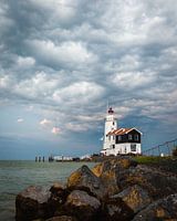Dunkle Wolken sammeln sich über dem Leuchtturm von Marken, auch das Pferd von Marken (Paard van Marken) genannt.