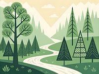 Dieses stilisierte Landschaftskunstwerk zeigt eine heitere Talszene. Ein heller, gewundener Weg schlängelt sich durch sanfte grüne Hügel, die mit verschiedenen stilisierten Bäumen übersät sind. Auf der linken Seite ragt ein höherer Laubbaum mit rundem Laub hervor, während auf der rechten Seite eine Gruppe spitzer, immergrüner Bäume mit…