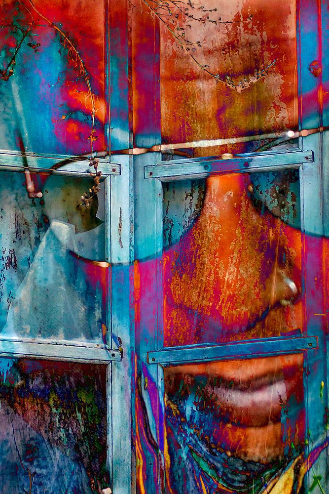 Digitale, surreale Foto-Collage mit eigenen Fotografien aus den Themen Porträt und Architektur, die zu verschiedenen Bildebenen im Photoshop verbunden wurden.