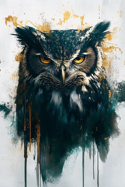 Dieses Kunstwerk stellt eine beeindruckende Eule mit einem intensiven, entschlossenen Blick dar. Mit seinen kontrastreichen Farben und subtilen Goldakzenten strahlt das Motiv Kraft und Geheimnis aus. Die ausdrucksstarken Pinselstriche und tiefen Strukturen verleihen dem Werk eine lebendige Energie, die den Eindruck erweckt, dass die…