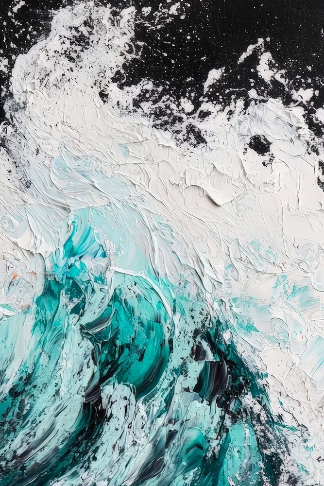 Kraftvolle Wellen reiten auf einem tiefschwarzen Hintergrund und erzeugen ein Gefühl von Bewegung und Dynamik. Die kräftigen Blautöne und spritzenden weißen Schaumkronen verleihen dem Kunstwerk eine lebendige Energie. Perfekt für ein modernes Wohnzimmer, bringt es eine frische, maritime Atmosphäre und lädt zum Träumen ein.