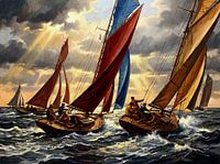 Bestelle diese Malerei Dynamisches Segelboot-Rennen mit dramatischem Himmel von Jan Keteleer als Reproduktion auf Leinwand, Alu-Dibond, als Poster, Fototapete oder Acrylglasbild.