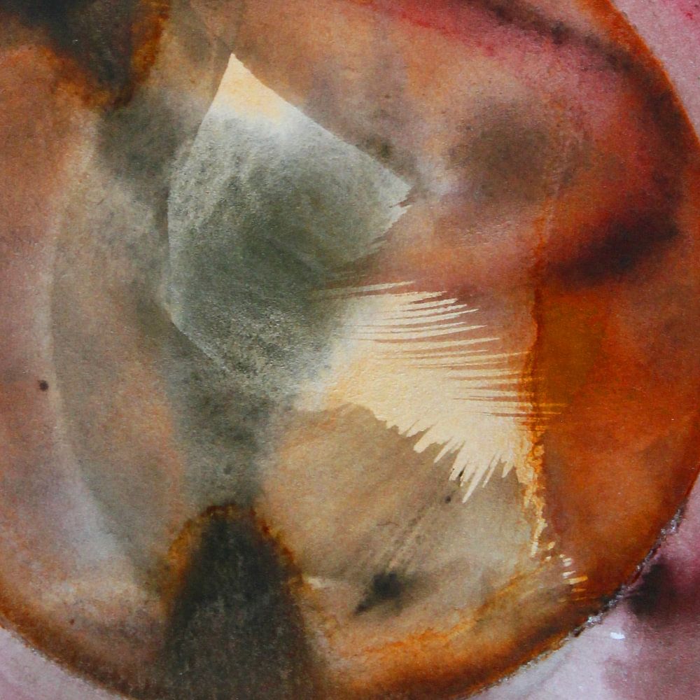 In der Mitte entfaltet sich ein warmer Kern aus Bernstein und Rost, umgeben von weichen Violett- und kühlen Grautönen. Die digitale Bearbeitung erzeugt ein Echo der Formen, eine vergrößerte Wiederholung, die sowohl Rhythmus als auch Stille hervorruft.