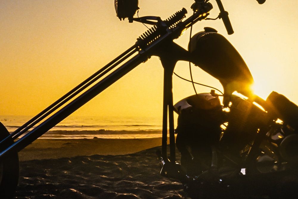 Easy Rider Harley Davidson Chopper als Silhouette bei Sonnenuntergang am Strand
