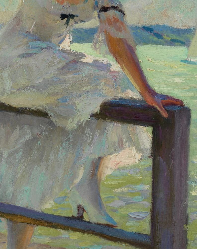 Eine junge Frau in einem weißen Kleid sitzt am Ufer des Wassers.
