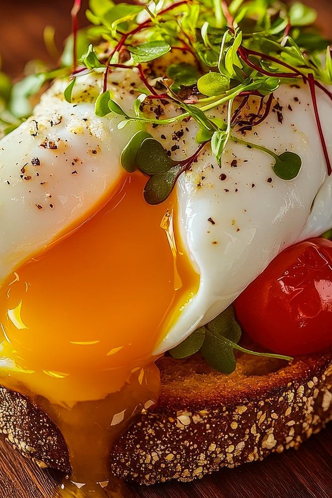 Ein kunstvolles Arrangement aus frischen, leuchtenden Zutaten erhebt ein einfaches Gericht zu einem Fest für die Sinne. Das weichgekochte Ei mit seiner goldenen Füllung, umrahmt von saftigen Tomaten und zarten Microgreens, lädt zum Schlemmen ein. Perfekt für die Küche oder das Esszimmer, bringt es Vitalität und Genuss in jeden Raum.