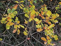 Obwohl viele Blätter an diesem Baum bereits gefallen sind, sind diese wenigen Zweige mit bunten Eichenblättern noch vorhanden und bilden einen schönen Kontrast zur Dunkelheit des Waldes. Aufgrund des milden Klimas in Umbrien, Italien, findet der Farbwechsel der Blätter eigentlich erst im Dezember statt.