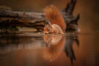 Dieses Eichhörnchen hat eine Nuss im Wasser gefunden und musste sie einfach haben. Zusammen mit der schönen Spiegelung im Wasser und den herbstlichen Farben war es für mich der absolute Hit.