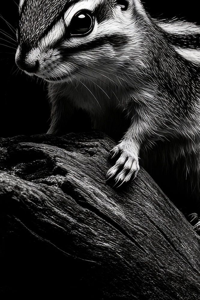 Ein energiegeladenes Eichhörnchen, das auf einem verwitterten Holzstück thront, strahlt eine faszinierende Weltenwende aus. Die monochrome Darstellung hebt die lebhaften Streifen und die feinen Details des Fells hervor. Ideal für das Wohnzimmer, bringt es einen Hauch von Natur und Lebhaftigkeit, der jeden Besucher zum Staunen bringt.