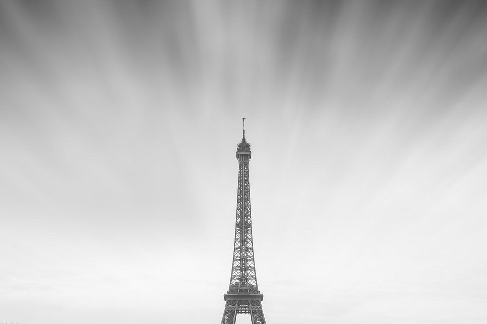 Wunderschöne atmosphärische Aufnahme des Eiffelturms in Paris, Frankreich, an einem grauen Frühlingstag mit lang gestrecktem Wolkeneffekt in Schwarz-Weiß