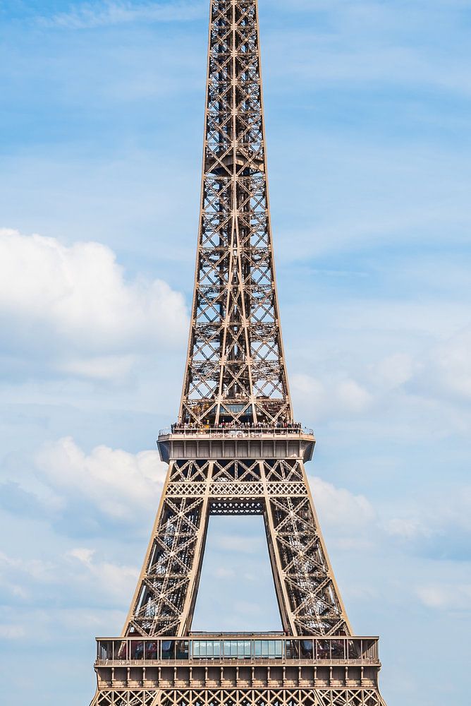 Der Eiffelturm in Paris an einem Tag im Sommer mit blauem Himmel und fluffigen Wolken im Hintergrund